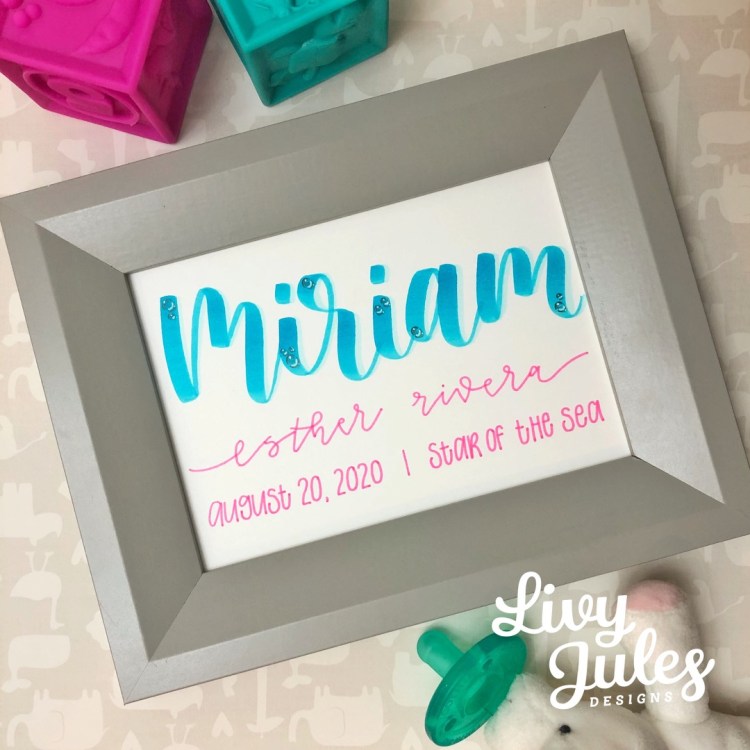 Livy Jules Designs creates custom hand-lettered cards, wall art, and affirmation stones, including baby name art and sympathy gifts. The shop also creates art for other occasions for babies and families.